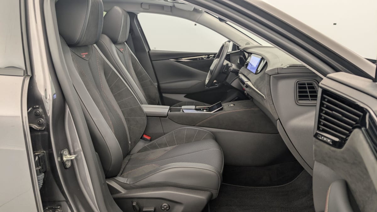 intérieur tissu tressé basalte avec alcantara : planche de bord en alcantara panneaux de portes en alcantara console centrale en alcantara sellerie en tissu tressé basalte avec alcantara et toile ds décors de panneaux de porte chrome guilloché volant en cuir fleur mistral avec surpiqûres ciel de pavillon salin