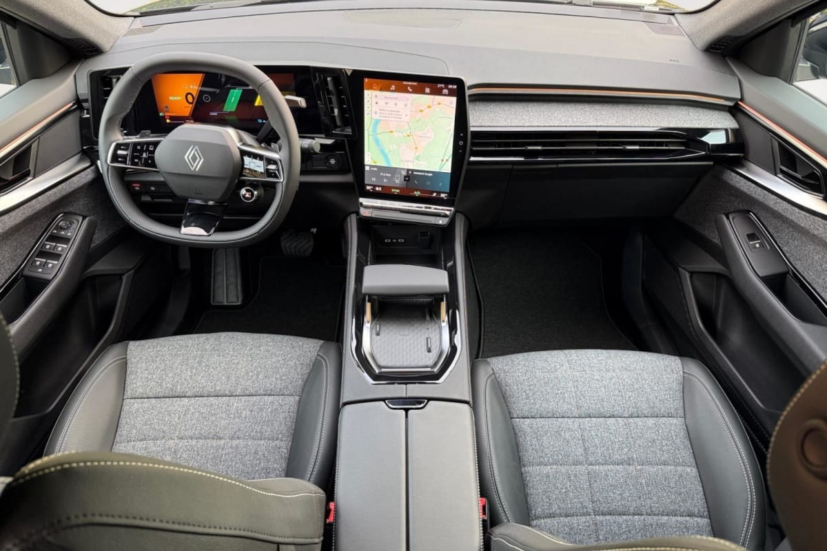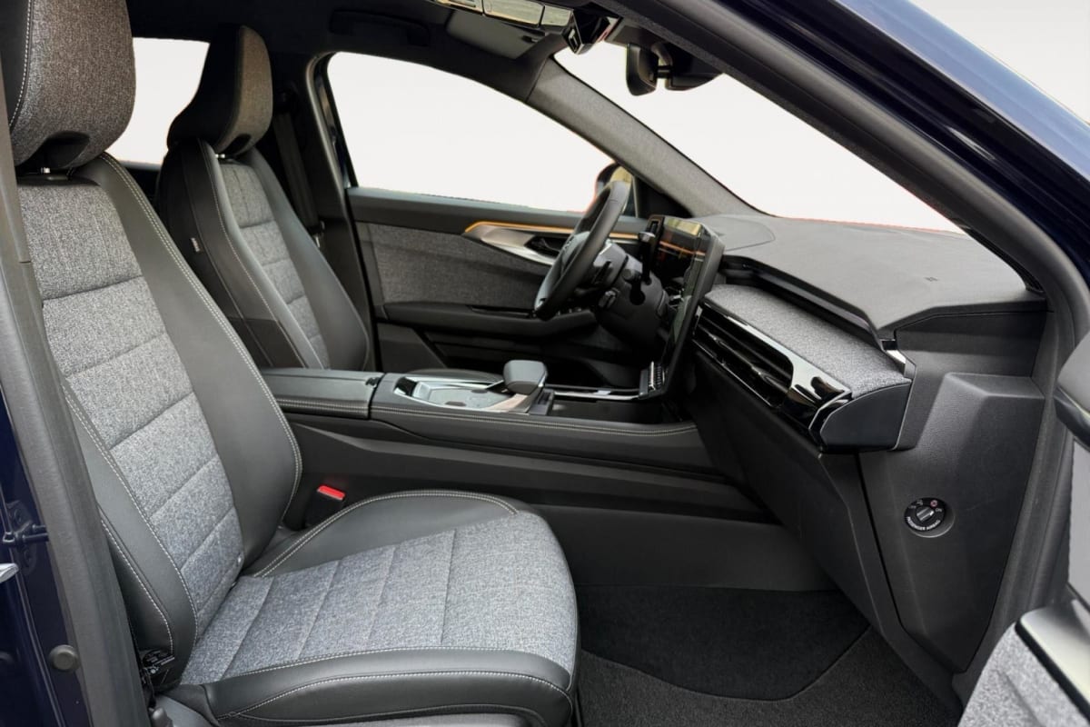 accoudoir central et inserts de portes en textile enduit grainé avec surpiqûres argent