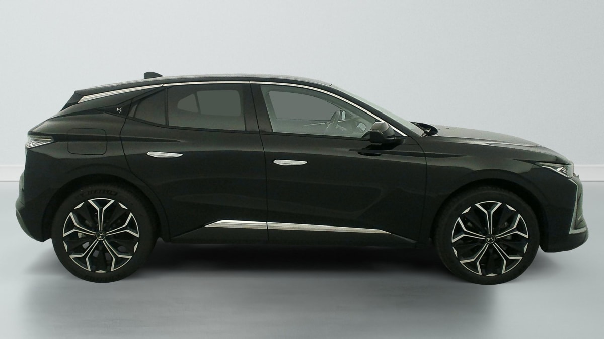 intérieur cuir grainé noir basalte et toile ds : ciel de pavillon clair décors de panneaux de porte chrome guilloché volant en cuir fleur mistral console centrale en toile ds mistral planche de bord en toile ds noir basalte façon écaille panneaux de portes en toile ds noir basalte façon écaille sellerie en cuir grainé noir basalte et toile ds