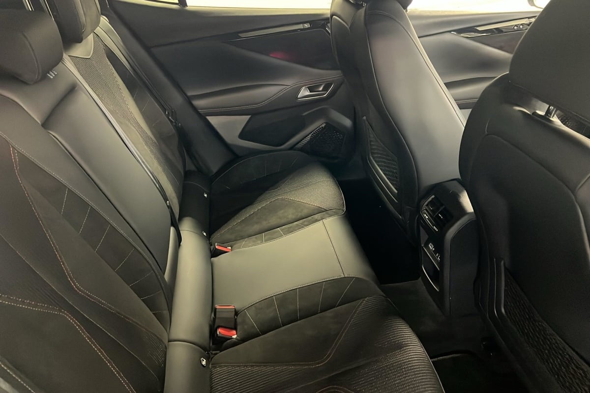 intérieur alcantara noir : ciel de pavillon clair décors alcantara performance line guillochage "clous de paris" platine plip avec insert chromé sellerie en tissu tressé basalte et alcantara performance line seuil de portes en métal performance line sièges av à haute densité surtapis av/ar volant cuir gainé avec surpiqûres performance line et insert carbone forgé