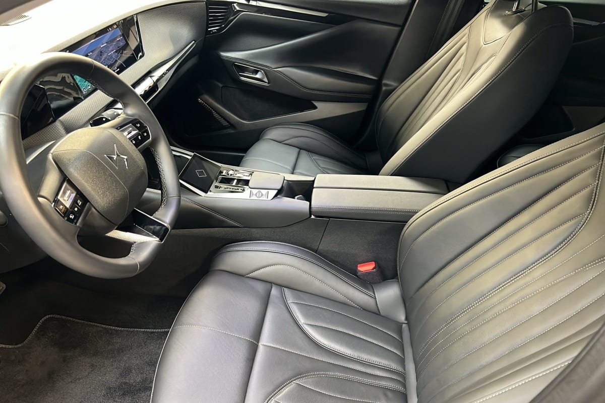 intérieur cuir grainé noir basalte et toile ds : ciel de pavillon clair décors de panneaux de porte chrome guilloché volant en cuir fleur mistral console centrale en toile ds mistral planche de bord en toile ds noir basalte façon écaille panneaux de portes en toile ds noir basalte façon écaille sellerie en cuir grainé noir basalte et toile ds parties centrales des sièges av, partie centrale des sièges latéraux ar et partie av des appuie-tête en cuir. bourrelets latéraux des sièges av, accoudoir central et siège central ar, et parties latérales et ar des appuis tête en toile ds.