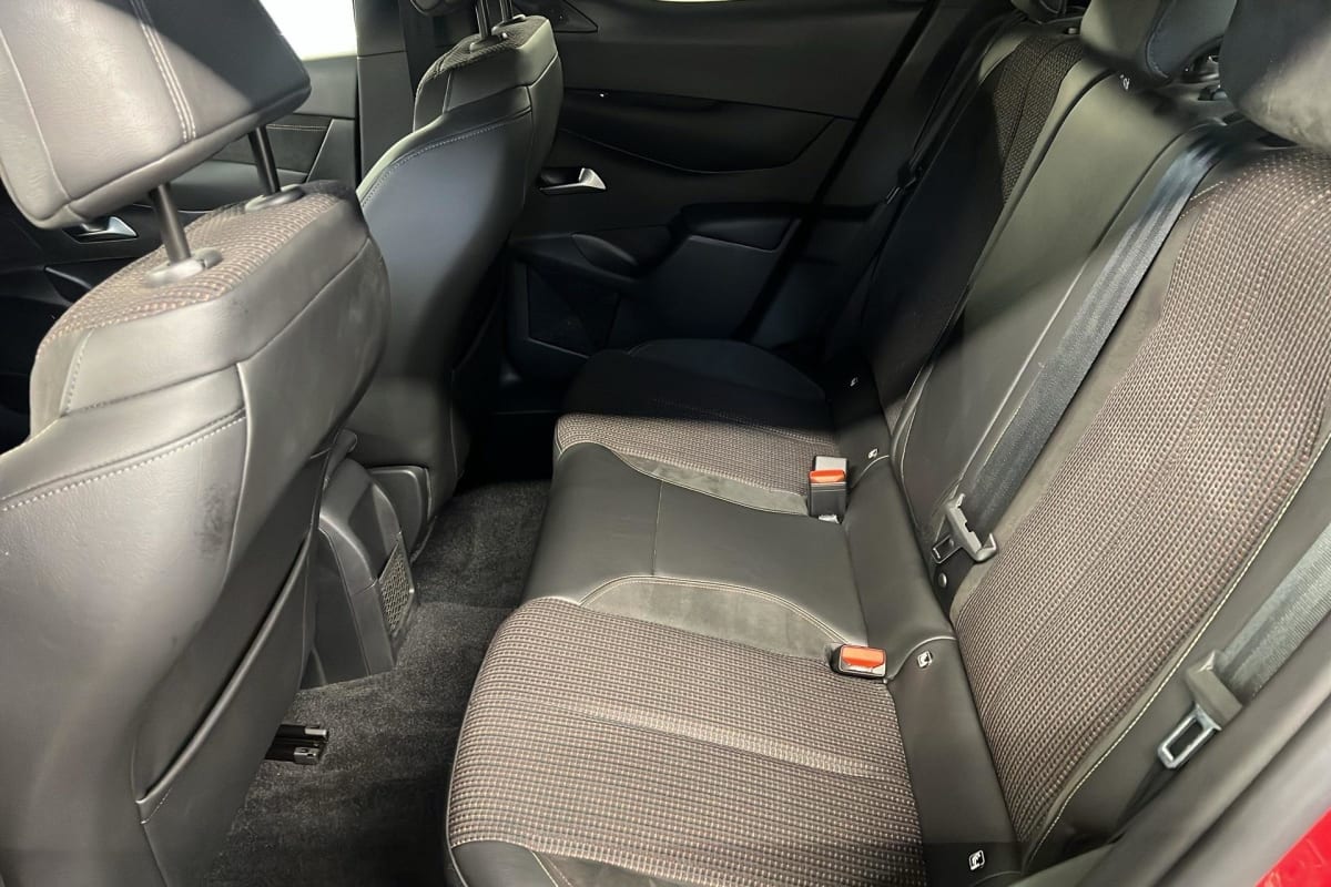 intérieur tissu tressé basalte avec alcantara : planche de bord alcantara noir ciel de pavillon gris galet volant cuir fleur perforé et coutures or et carmin décor alcantara noir siège tissu tressé basalte avec alcantara