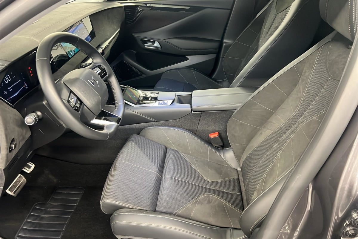 intérieur alcantara noir : planche de bord en alcantara ciel de pavillon clair sellerie en tissu tressé basalte avec alcantara et toile ds décors de panneaux de porte chrome guilloché volant cuir fleur mistral console en toile ds noir basalte panneaux de porte en alcantara et toile ds noir basalte