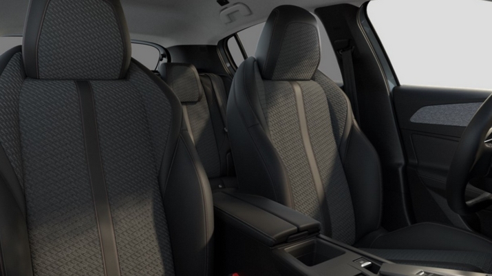 eléments de design intérieur : planche de bord moussée avec décor tissu gris chiné + panneaux de portes avec décor tissu gris chiné + accoudoirs de portes en similicuir avec surpiqûres gris tramontane + éclairage des caves à pieds av à led